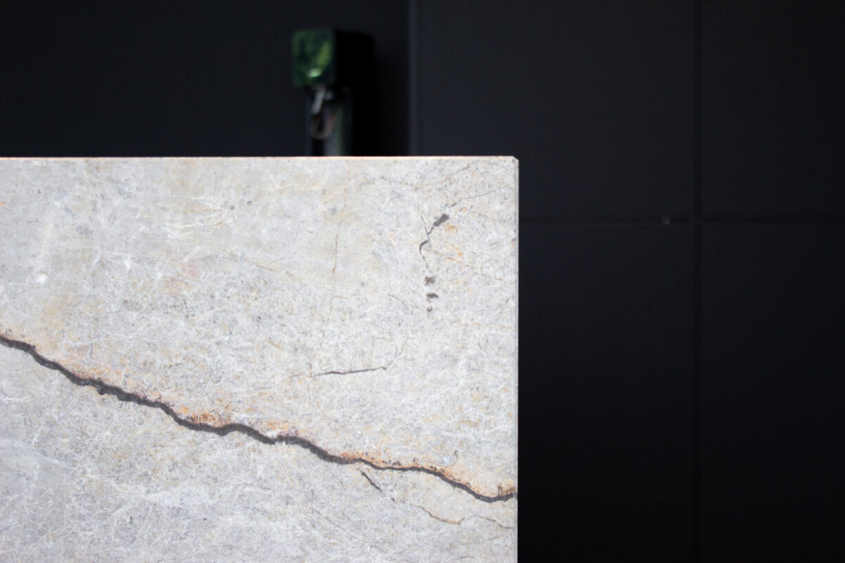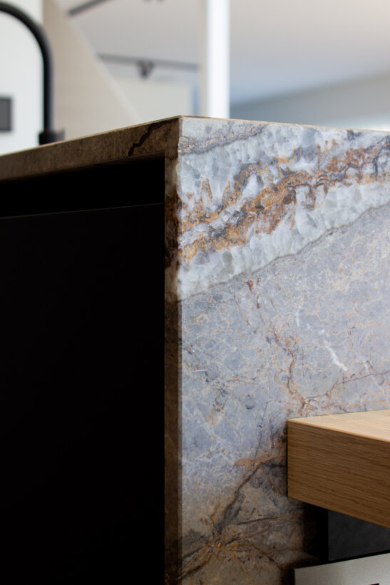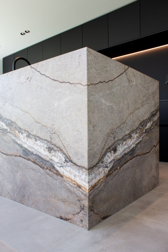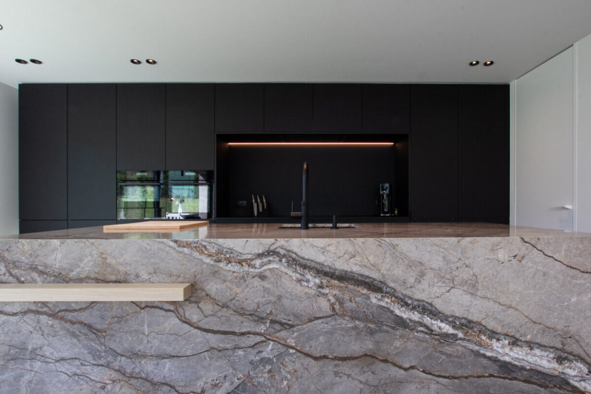 Het eiland werd uitgevoerd in het prachtige Silver Roots marmer. De pérfecte combinatie met de donkere achterwand. Het eiland trekt alle aandacht naar zich toe en zorgt tegelijk voor warmte.