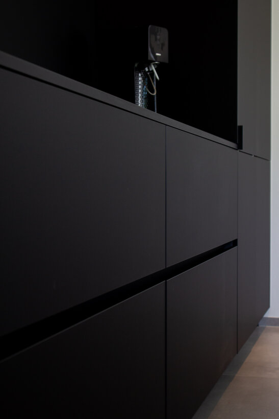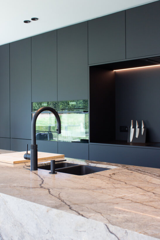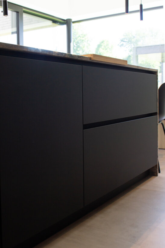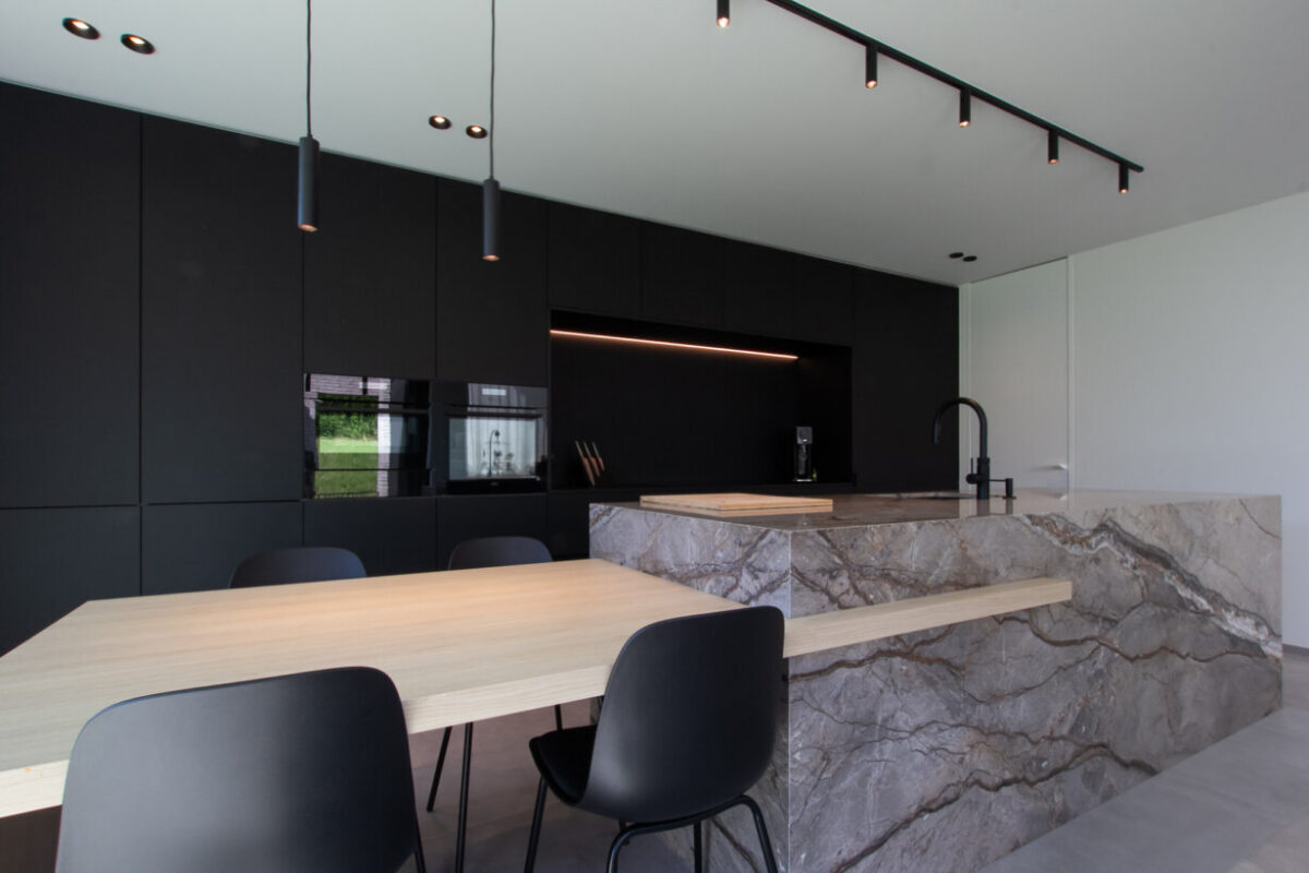Black and Marble, de perfecte combinatie als je het ons vraagt. De klant wou een strakke keuken, maar wel met warmte. Dat er zwart in moest komen stond vast, dus hebben we de volledige achterwand uitgevoerd in onze PASO reeks.