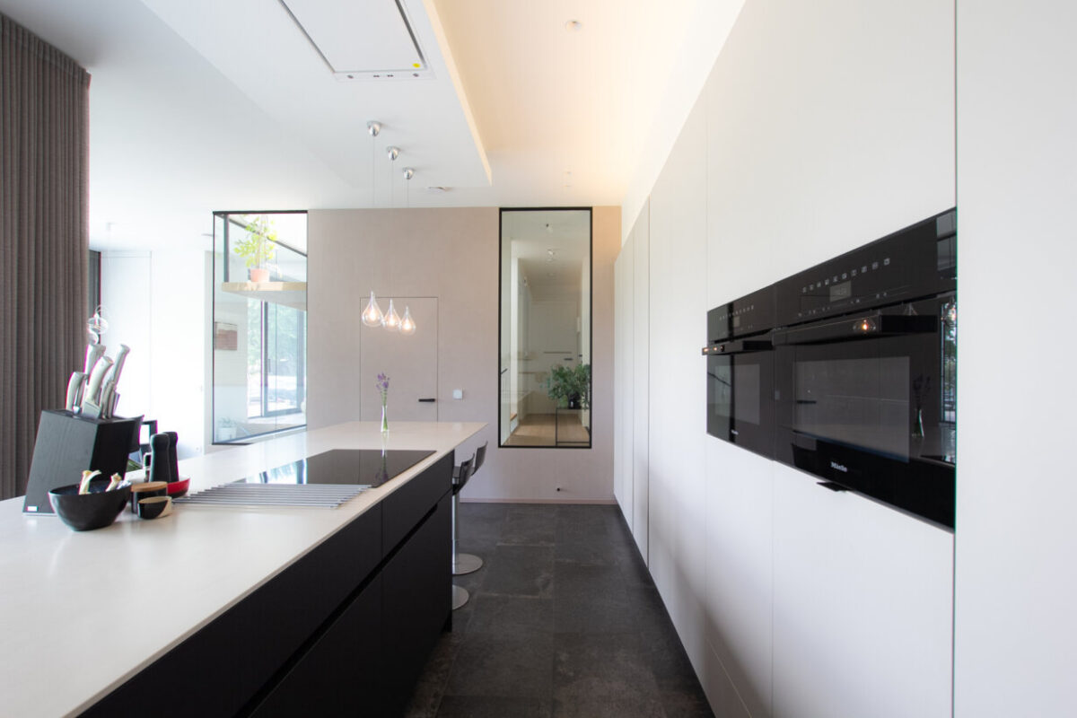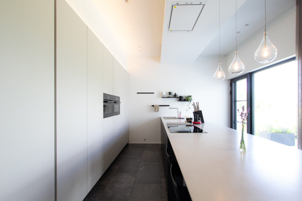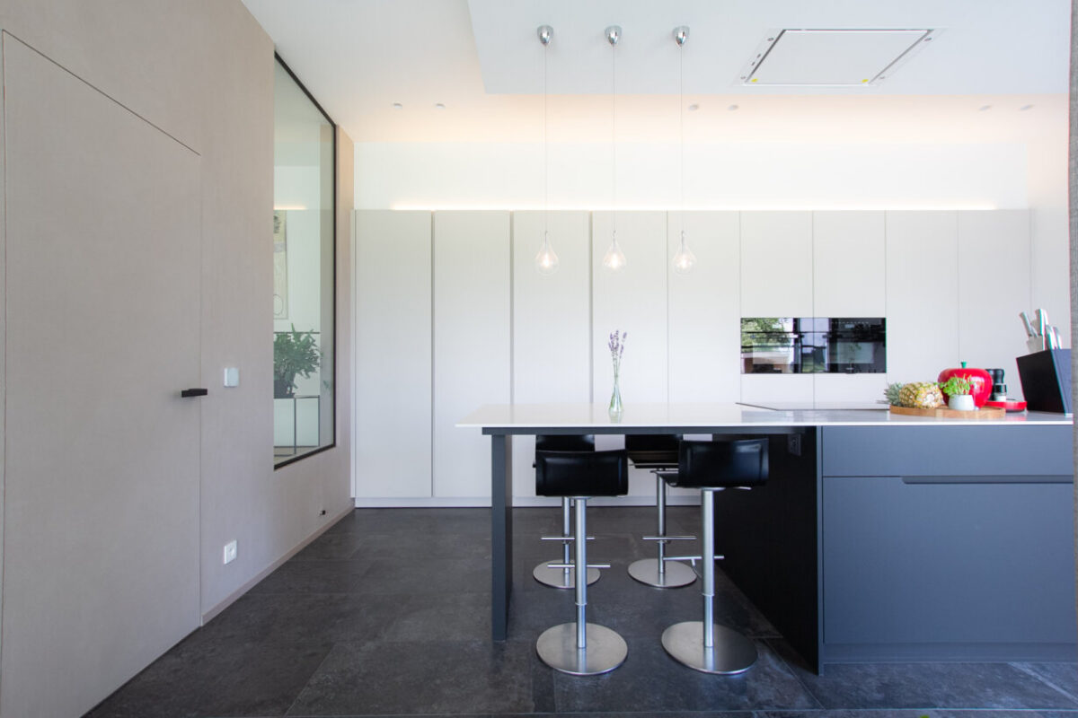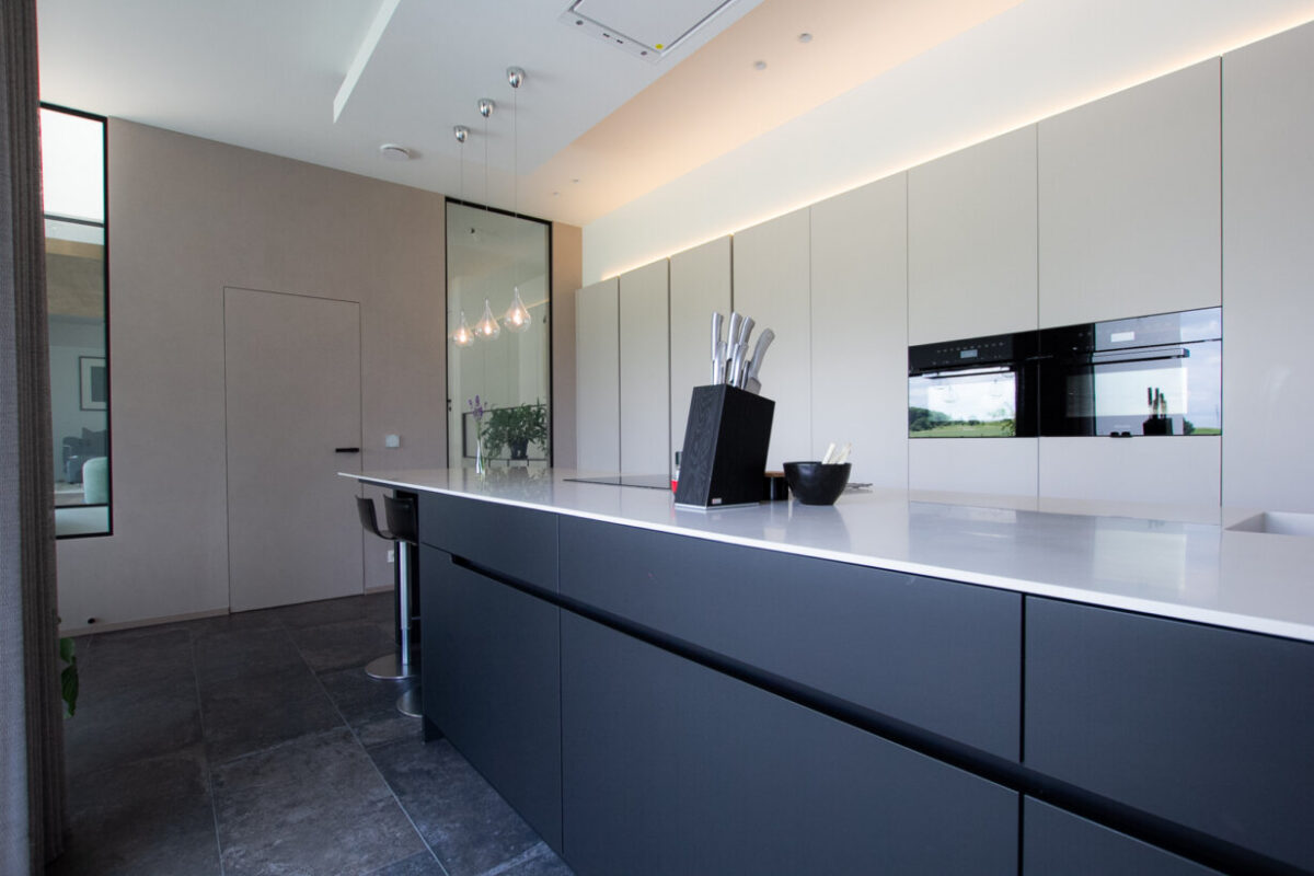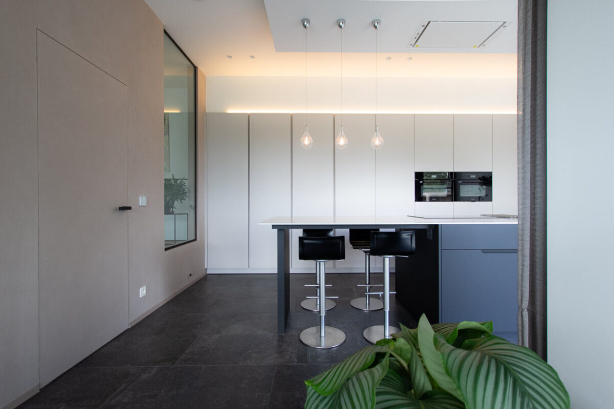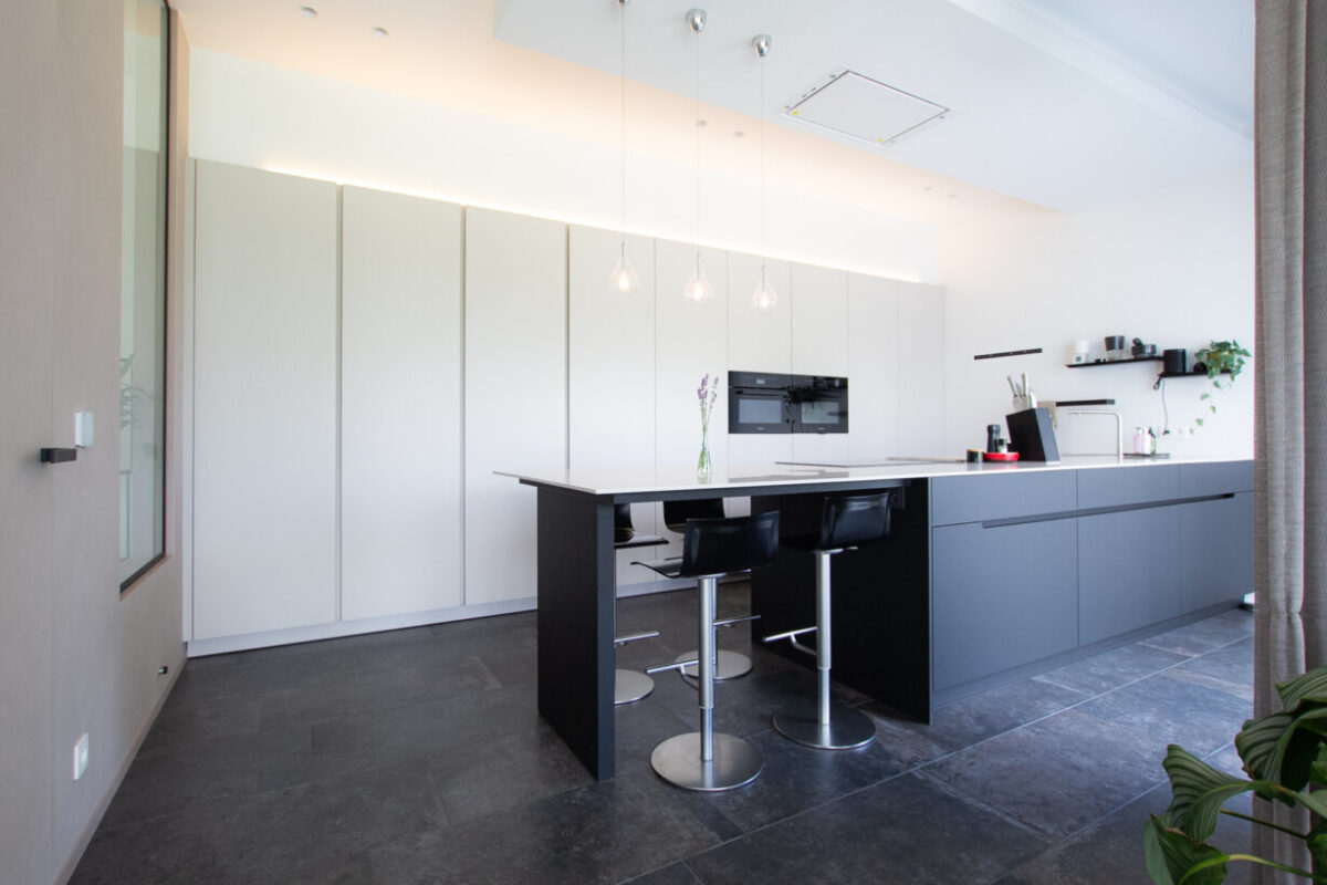 In deze woning hebben we gekozen voor een unieke benadering van de keukenontwerpen. We wilden iets speciaals creëren dat niet alleen functioneel is, maar ook een visueel statement maakt. Met slimme keuzes in materialen, verlichting en ontwerpdetails hebben we een keuken gecreëerd die zowel modern als tijdloos is.