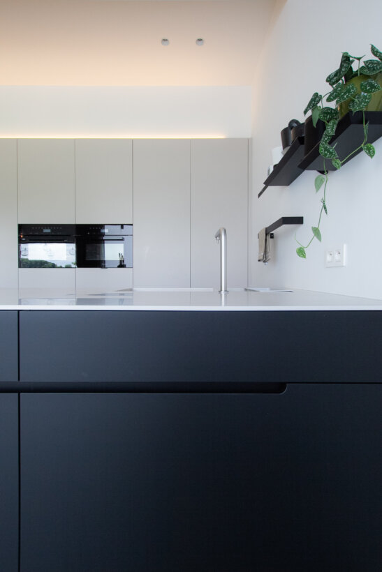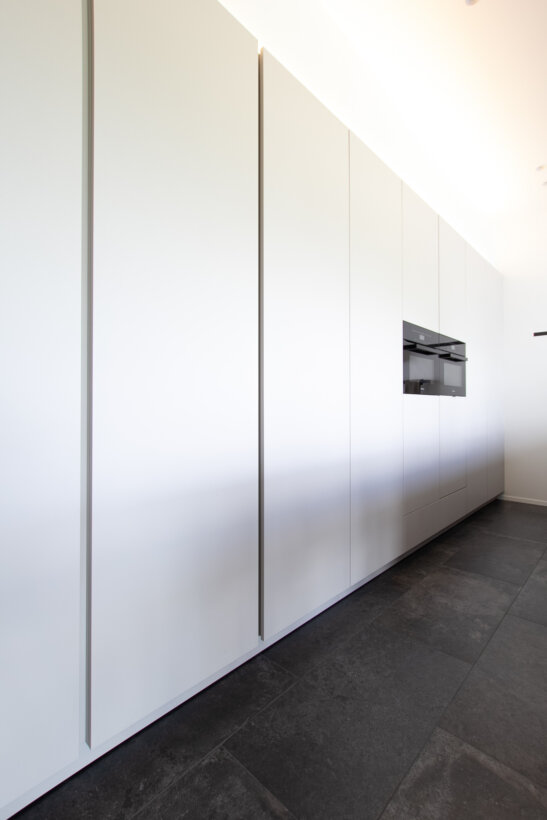 Om de wand net iets specialer te maken pasten we verticale, greeploze stijlen toe in combinatie met de -iets strakkere- push-to-open kasten rond de toestellen.