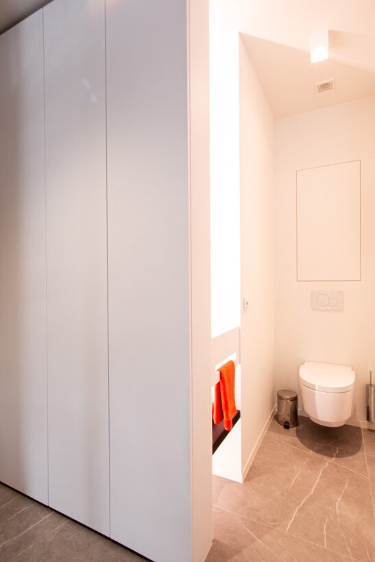 In de master bathroom en extra badkamer hebben we maatwerk lavabomeubels geplaatst, volledig vervaardigd uit Corian. Deze meubels, geïnspireerd op het keukenwerkblad, bieden niet alleen een strak uiterlijk maar zijn ook zeer onderhoudsvriendelijk. De naadloze douchewanden, 100% waterdicht en perfect gecombineerd met de tegels, zijn niet alleen mooi om te zien maar ook duurzaam en makkelijk in onderhoud.