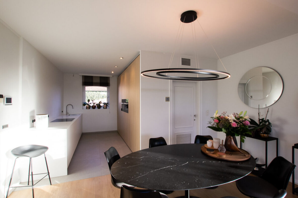 In deze keuken voerden we de lagere kasten en werkblad uit in Corian. Deze worden perfect gecomplementeerd door de kolomkasten in licht eiken fineer. Zo wordt een een unieke visuele dynamiek gecreëerd die de ruimte verrijkt.