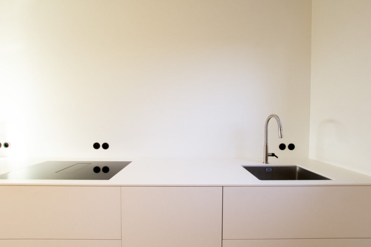 Het werkblad, de fronten en de volledige achterwand, allen uitgevoerd in Corian, zijn naadloos geïntegreerd in het ontwerp. De subtiele, naadloos verlijmde poot draagt bij aan de algehele cohesie van het geheel. Het slim geïntegreerde design van de stopcontacten in de wand zorgt voor een strakke afwerking, waarbij functionaliteit en esthetiek hand in hand gaan.